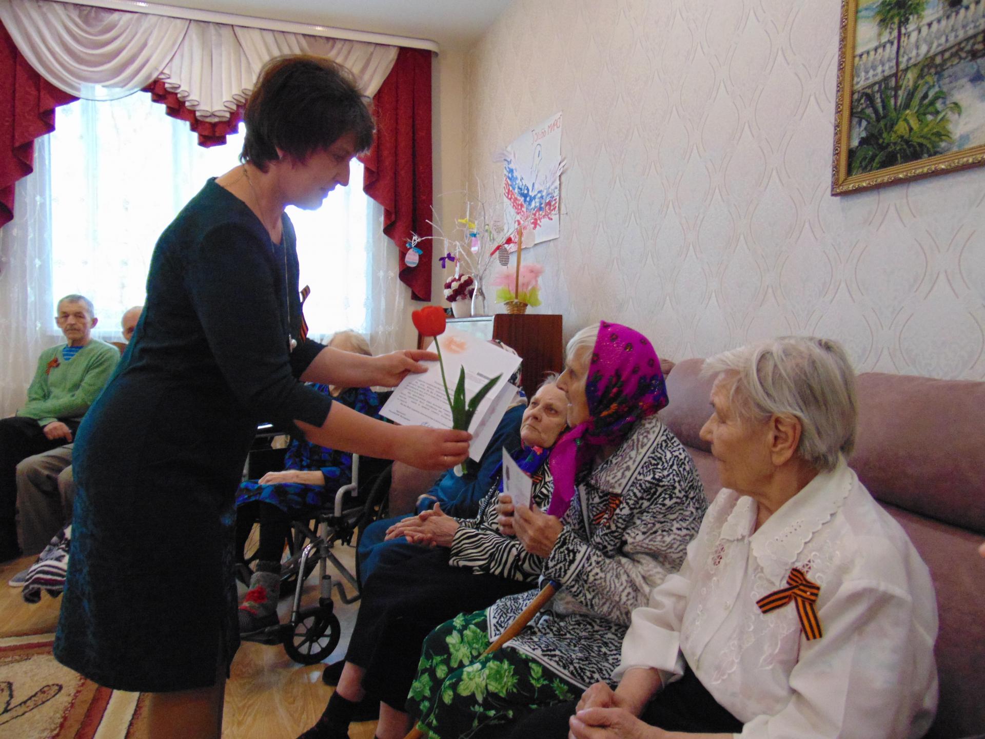 75 лет назад отгремели выстрелы самой большой, трагической и незабываемой Великой Отечественной войны. Нет более значимого народного праздника для каждого россиянина, чем День Победы. 75 лет мира, благополучия и процветания, за которые мы обязаны тем героям, которые остались на полях сражений, и тем, кто выжил и активно восстанавливал разрушенное войной. В Тургеневском отделении милосердия проживают четыре труженика тыла и четырнадцать детей войны, к которым и персонал и проживающие ежедневно проявляют максимум заботы и тепла. Сегодня каждый сказал им много добрых и ободряющих слов. В торжественной обстановке с 75-й годовщиной Дня Победы всех присутствующих поздравила заведующая отделением Кочеткова Г.В.: она выразила слова признательности участникам мероприятия за немалый вклад в Победу, зачитала поздравления от Президента РФ и вручила «виновникам торжества» открытки, юбилейные медали, подарки и цветы. Также к поздравлениям присоединились  коллективы КДЦ д.Тургенево и с. Селино. В видео формате друзья пожелали получателям социальных услуг здоровья на долгие годы, мирного неба над головой, исполнили военные песни и стихи. Присутствующие были рады увидеть знакомые лица (хотя бы через экран телевизора) и поблагодарили за оказанное внимание.