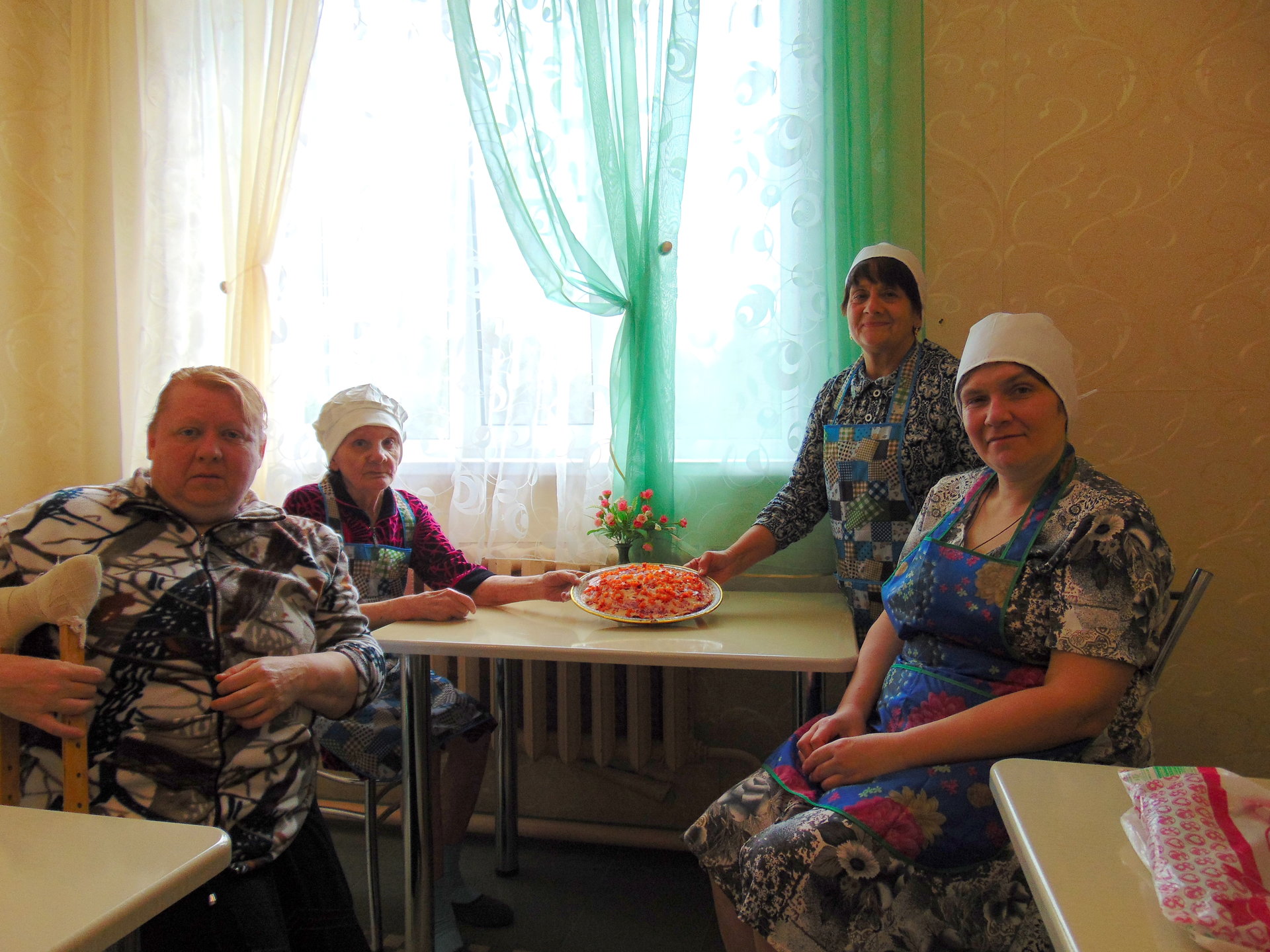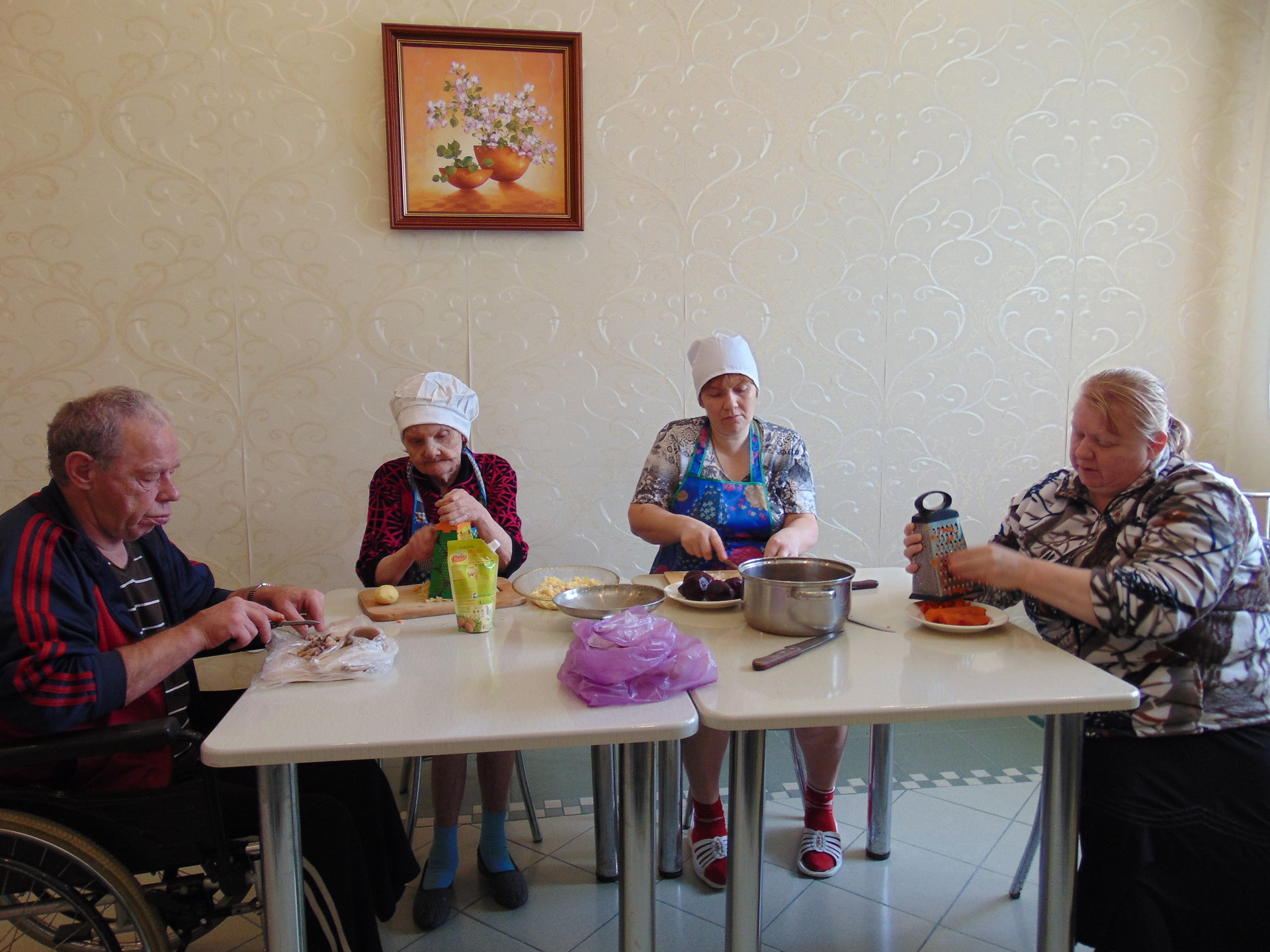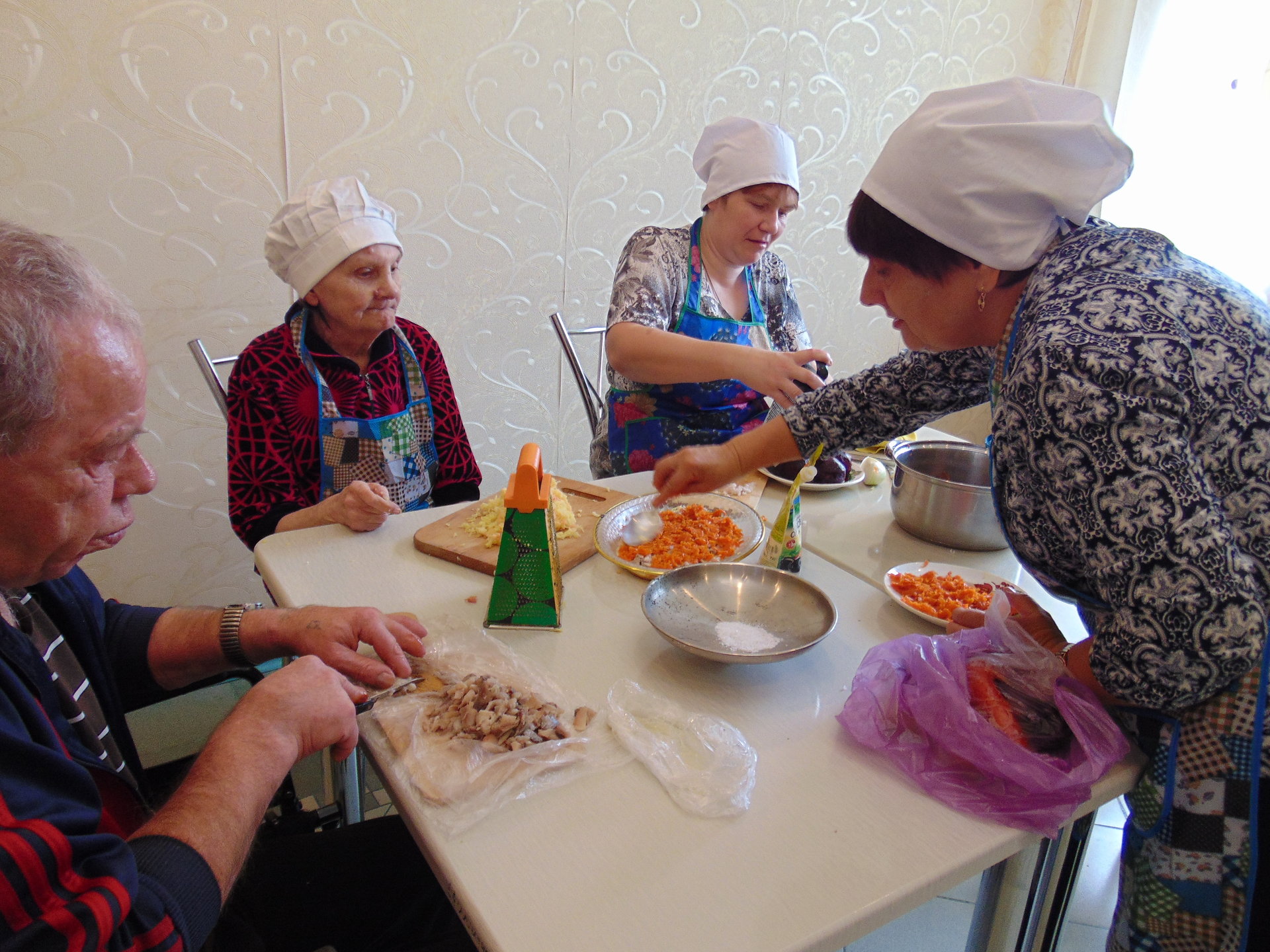 На очередном кулинарном занятии в Тургеневском отделении милосердия получатели социальных услуг готовили всеми любимый салат «Селедка под шубой». Рецепт этого салата - кулинарное изобретение хозяек советского времени, не теряющий своей популярности и в наше время. Проживающие с удовольствием окунулись в свою молодость, вспомнили, как готовили этот салат в своих семьях. Как обычно, распределив работу, «кулинары» почистили овощи, аккуратно порезали и красиво уложили ингредиенты на блюдо. Приготовленная своими руками «селедка под шубой» всем очень понравилась, угостились не только «повара», но и все желающие.