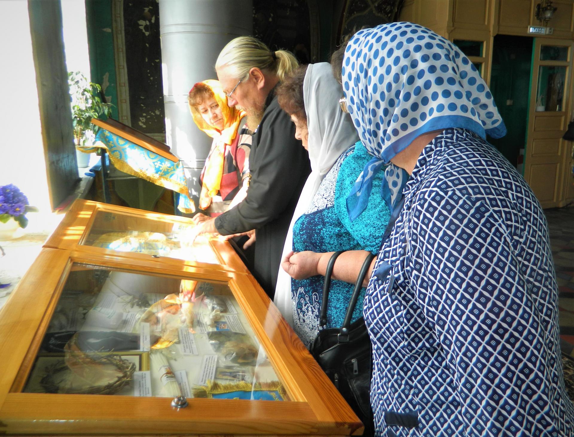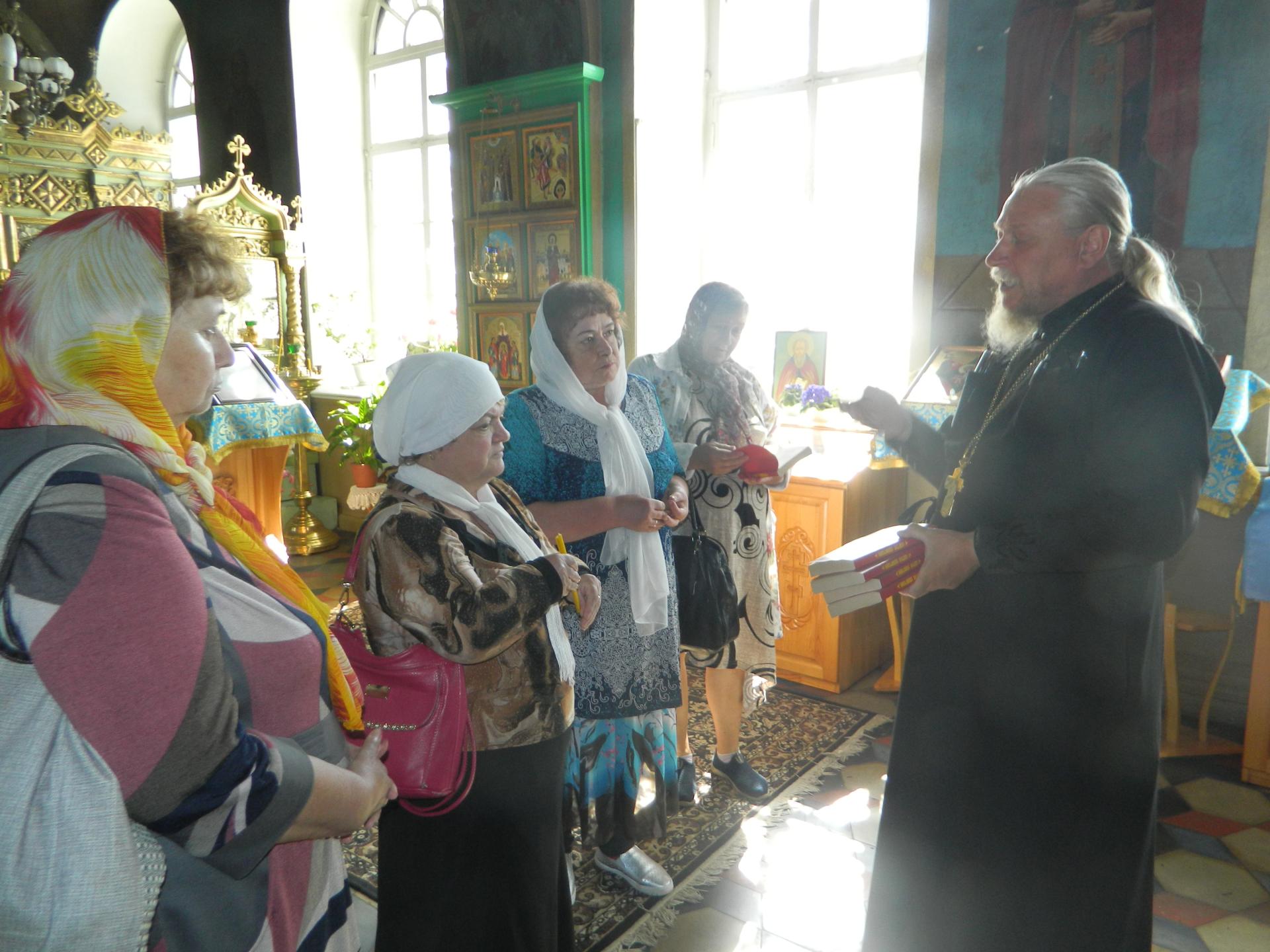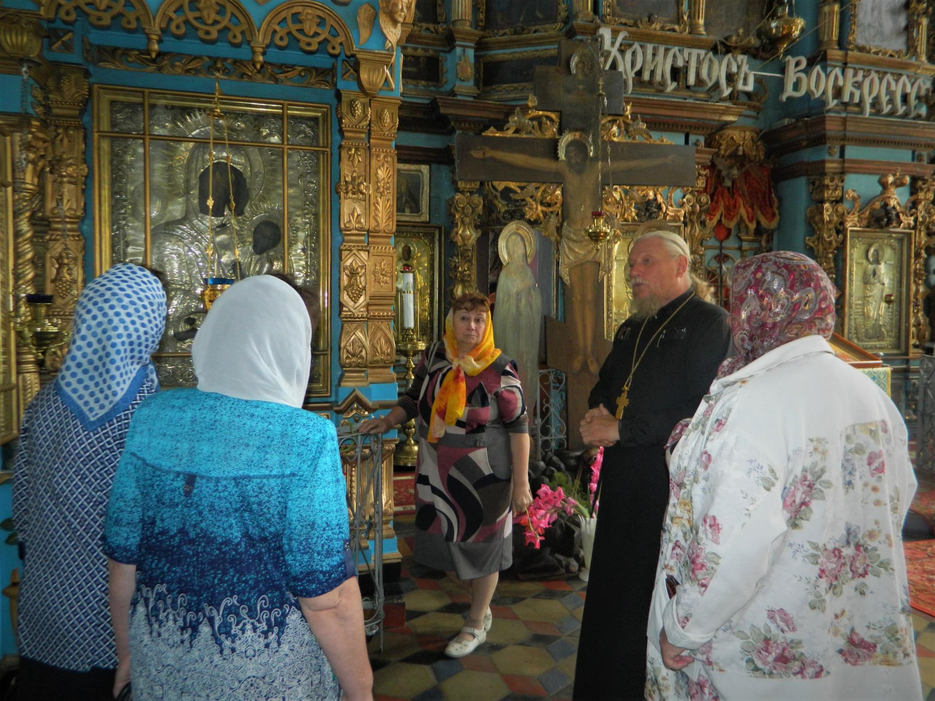 У входа в храм группу граждан старшего поколения с теплотой и доброжелательностью встретил Отец Игорь. Он познакомил экскурсантов с летописью и хронологией служения в храме, начиная 1850 года, рассказал обо всех строениях, истории их возникновения и предназначения.
