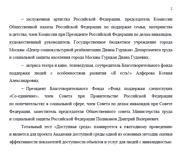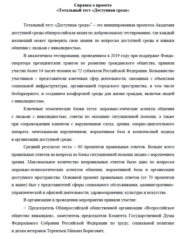 направлен на повышение уровня осведомленности граждан о существующих проблемах им потребностях людей с инвалидностью. 3 декабря 2020 года в Международный день инвалидов проводится общероссийская онлайн-акция по добровольному тестированию граждан на тему доступной среды и инклюзивного общения.